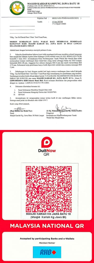 Dana Wakaf Pembinaan Baru Masjid Kampung Jawa Batu 18
